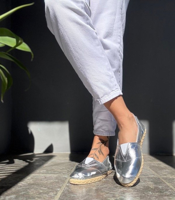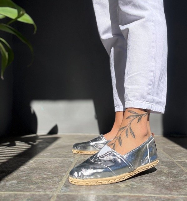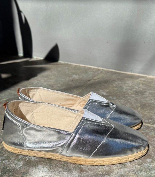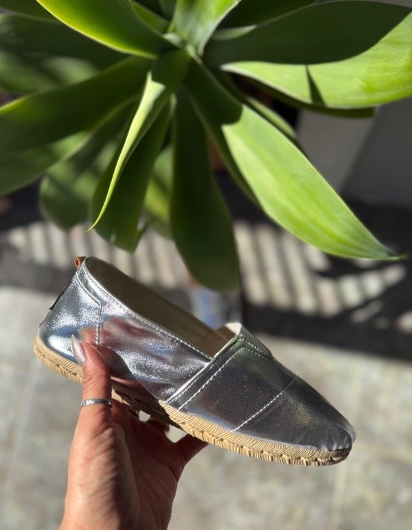 ALPARGATAS confeccionadas en eco cuero plateado, interior forrado con plantilla forrada. Base de goma símil yute.