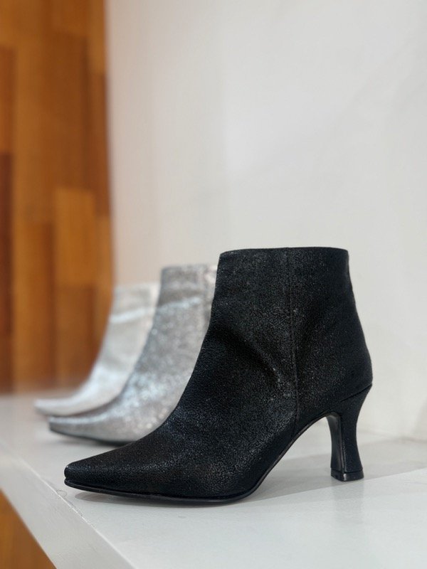 Botas PAZ color negro, confeccionadas en cuero vegano con glitter, forradas y con pequeño cierre lateral. Taco Kitten de 6,5 cms. Caña arriba de los tobillos. Ideales para brillar y no pasar desapercibida!