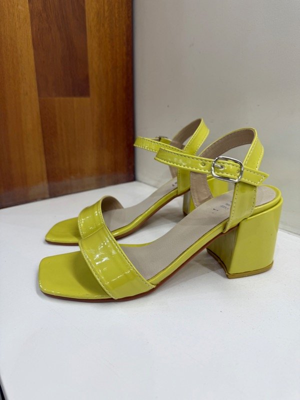Sandalias confeccionadas en cuero vegano charol con taco de 6 cms