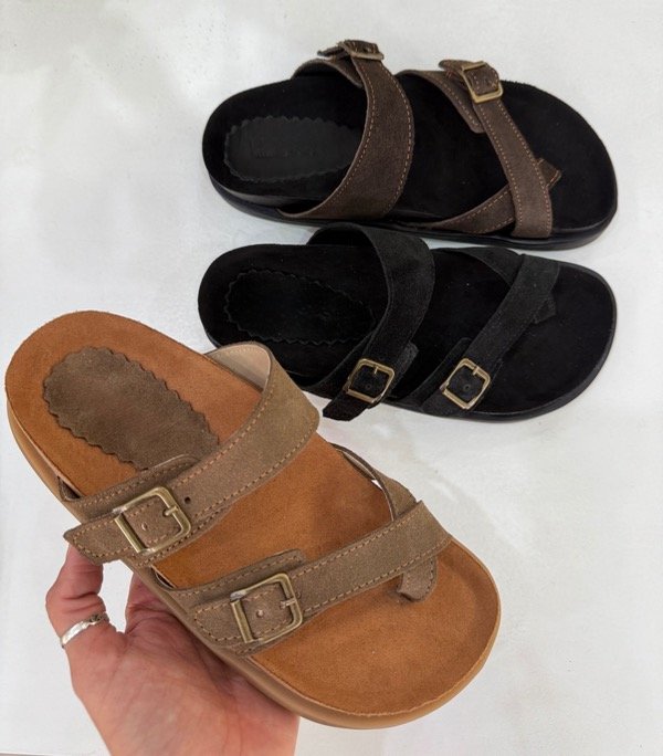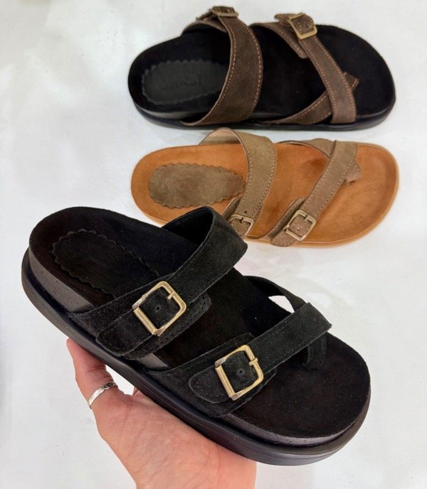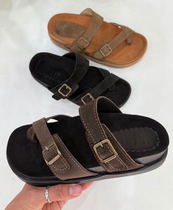 Sandalias confeccionadas en cuero vacuno (gamuza) con base de goma y plantilla anatómica termoformada. Con hebillas, regulables.