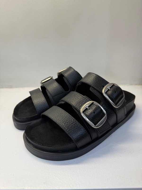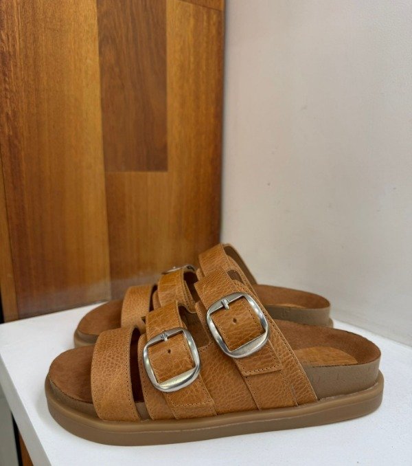 Sandalias confeccionadas en cuero vacuno con base de goma TR y plantilla anatómica termoformada. Con hebillas, regulables.