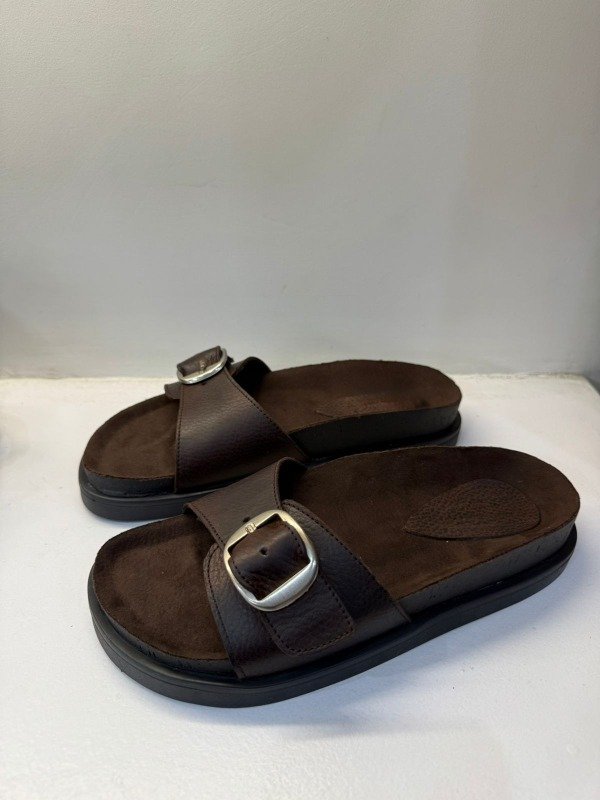 Sandalias confeccionadas en cuero vacuno con base de goma y plantilla anatómica termoformada. Regulables, se abren en su totalidad para facilitar el calce.