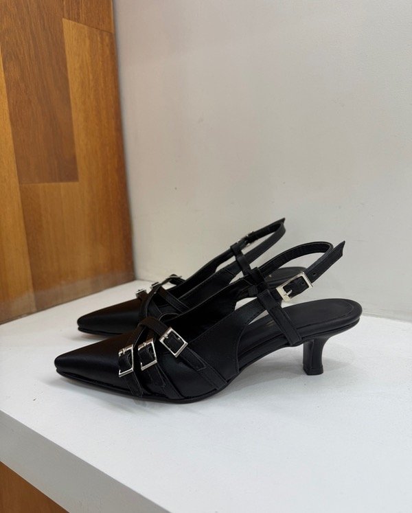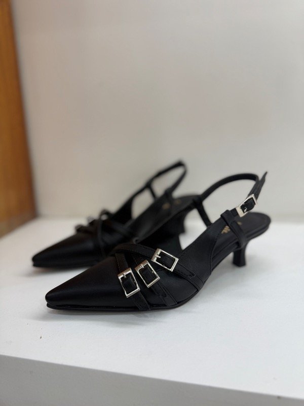 Nuevos stilettos sin talones, confeccionados en eco cuero, hebillas y taco chupete de 4 cms. Poseen base antideslizante. Interior forrado